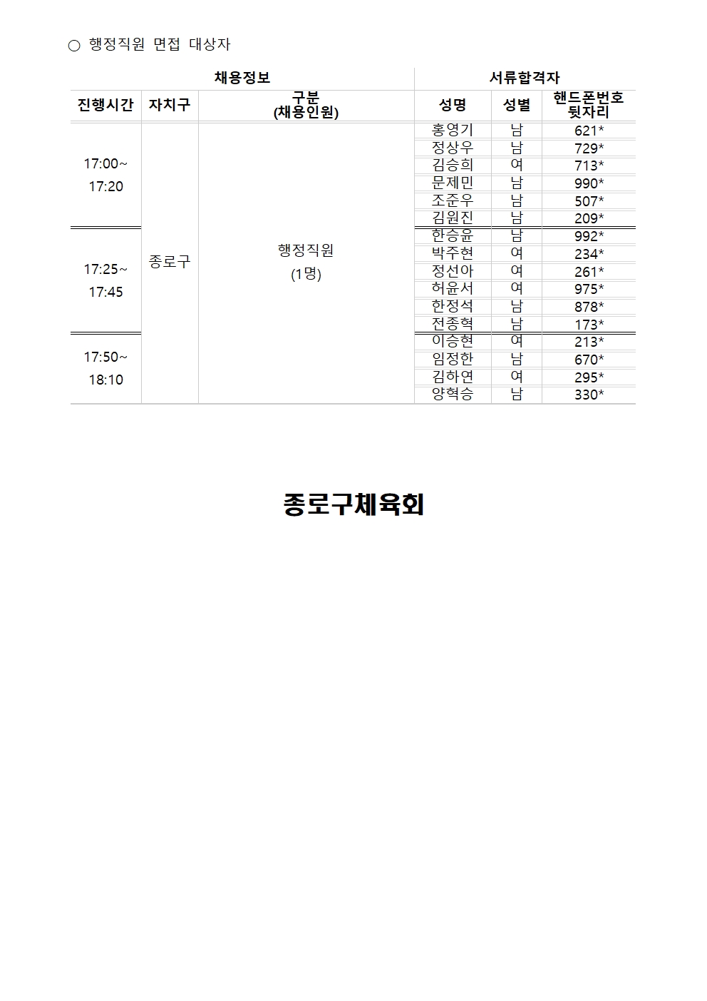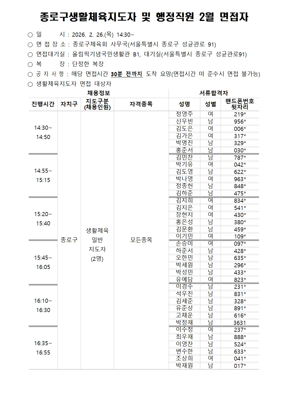2월 생활체육지도자, 행정직원 서류합격자 및 면접안내