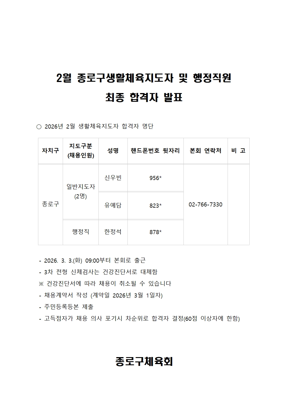 2026년 2월 종로구생활체육지도자 및 행정직원 최종합격자 발표